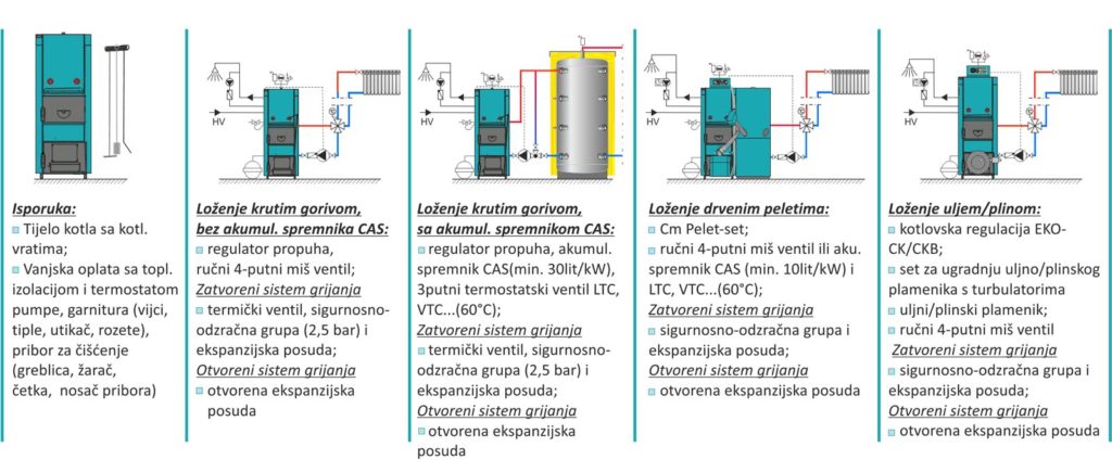 Toplovodni kotao za centralno grijanje predviđen za loženje s više vrsta goriva (kruto, peleti, tekuće), nazivnog toplinskog učina od 14 do 110 kW. Odgovarajuće dimenzionirano ložište te vođenje plinova izgaranja …